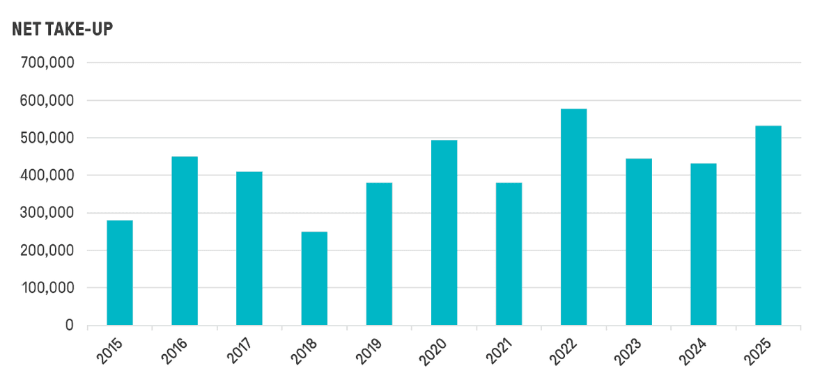 Za celý rok 2025 tak trh zaznamenal čistý dopyt 532 100 m², čím prekonal výsledok roka 2024 (431 700 m²). Po období opatrnejšieho rozhodovania firiem sa tak aktivita v závere roka výrazne posilnila.